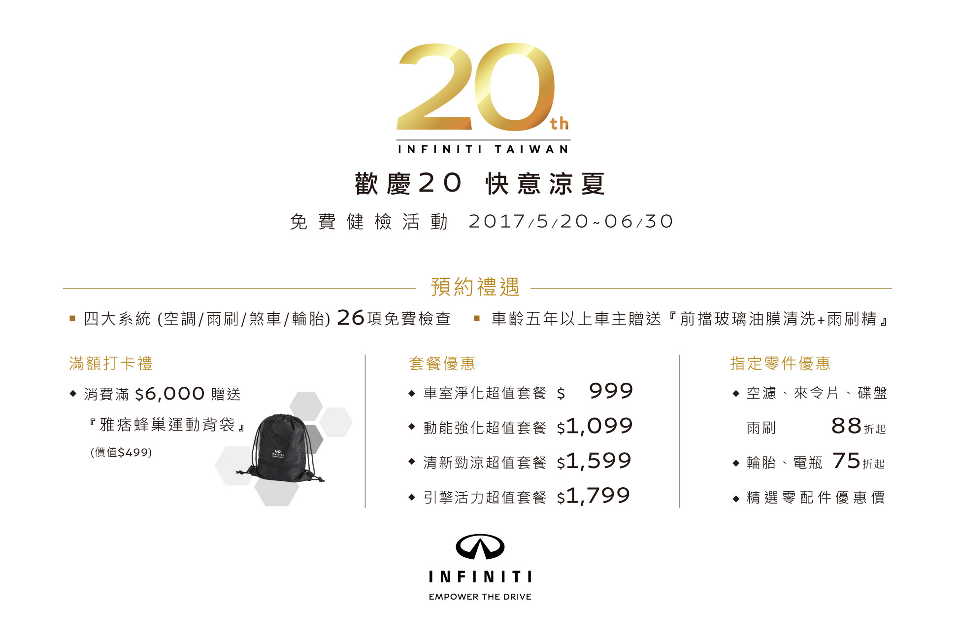 為回饋車主,於INFINITI 2017「歡慶20 快意涼夏」免費健檢活動期間,INFINITI TAIWAN不僅提供四大系統26項免費檢查(註2),更提供全車系「引擎活力超值套餐」、「動能強化超值套餐」、「清新勁涼超值套餐」、「車室淨化超值套餐」四項超值保養套餐「快意價」回饋(註3)。此外,來令片、碟盤、空調濾網、雨刷、輪胎、電瓶、指定配件等,更提供75折起之季節禮遇。當日單筆消費滿新台幣6,000元(含)以上並於個人FB頁面完成打卡者,更免費贈送精美「雅痞蜂巢運動背袋」一只。