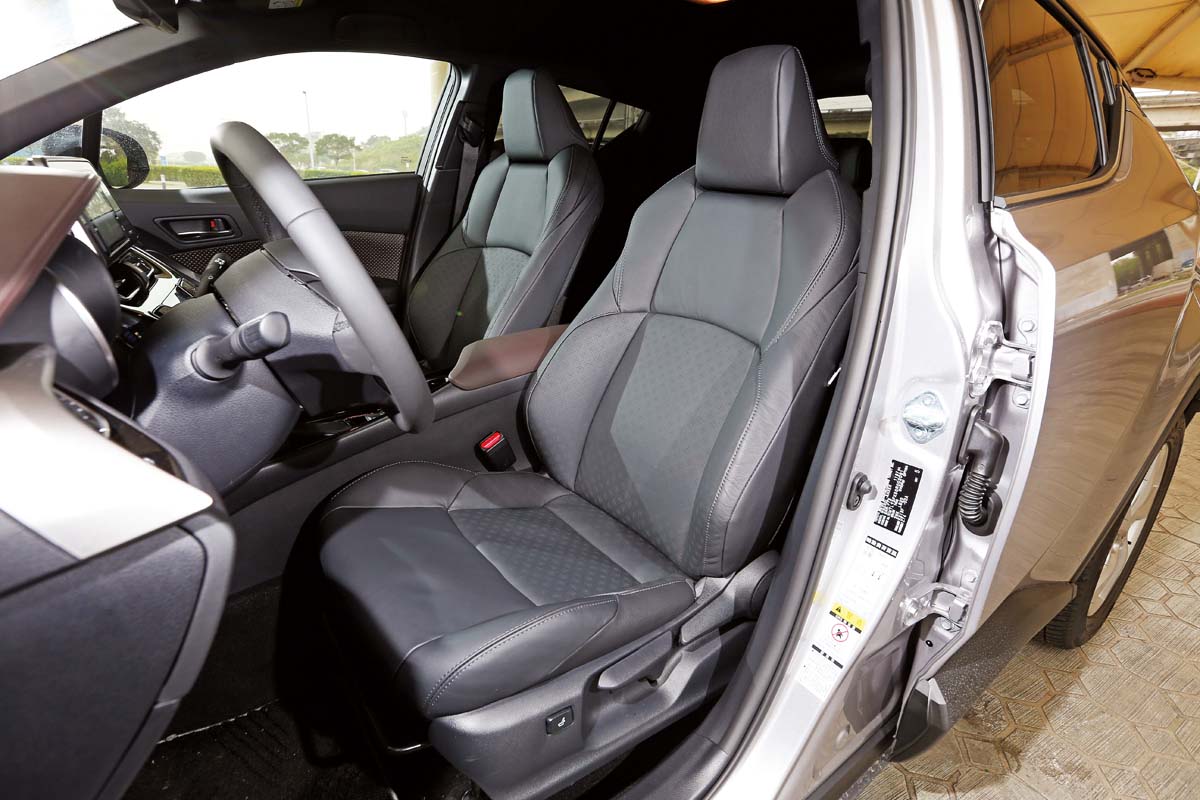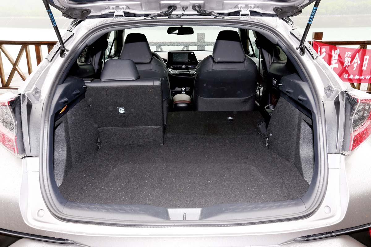 配備方面表現可圈可點,入門車型就已配置電子手煞車、多媒體觸控系統、雙區恆溫等,而此次評比的豪華版車型更增加Push Start、倒車顯影、雙前加熱座椅、定速巡航配備(頂規車型增加四驅系統、LED頭燈、DTC等項目)。整體配備頗具水準,但與對手相比售價便顯得略高,不過對於此級距消費者來說仍在可接受範圍內。至於空間方面,C-HR讓人相當意外,實際乘坐比國外媒體評價來得寬敞許多,幾近10cm的膝部餘裕空間搭配座椅設定更是稱得上舒適,接近房車的低著坐點對於乘坐舒適度也帶來助益,只是C柱與車窗面積小設計會有幽閉緊迫的感受。至於在行李廂部分擁有最寬的表現,置物深度也有中上水準,但在高度與下緣離地高項目就顯得弱勢不理想。