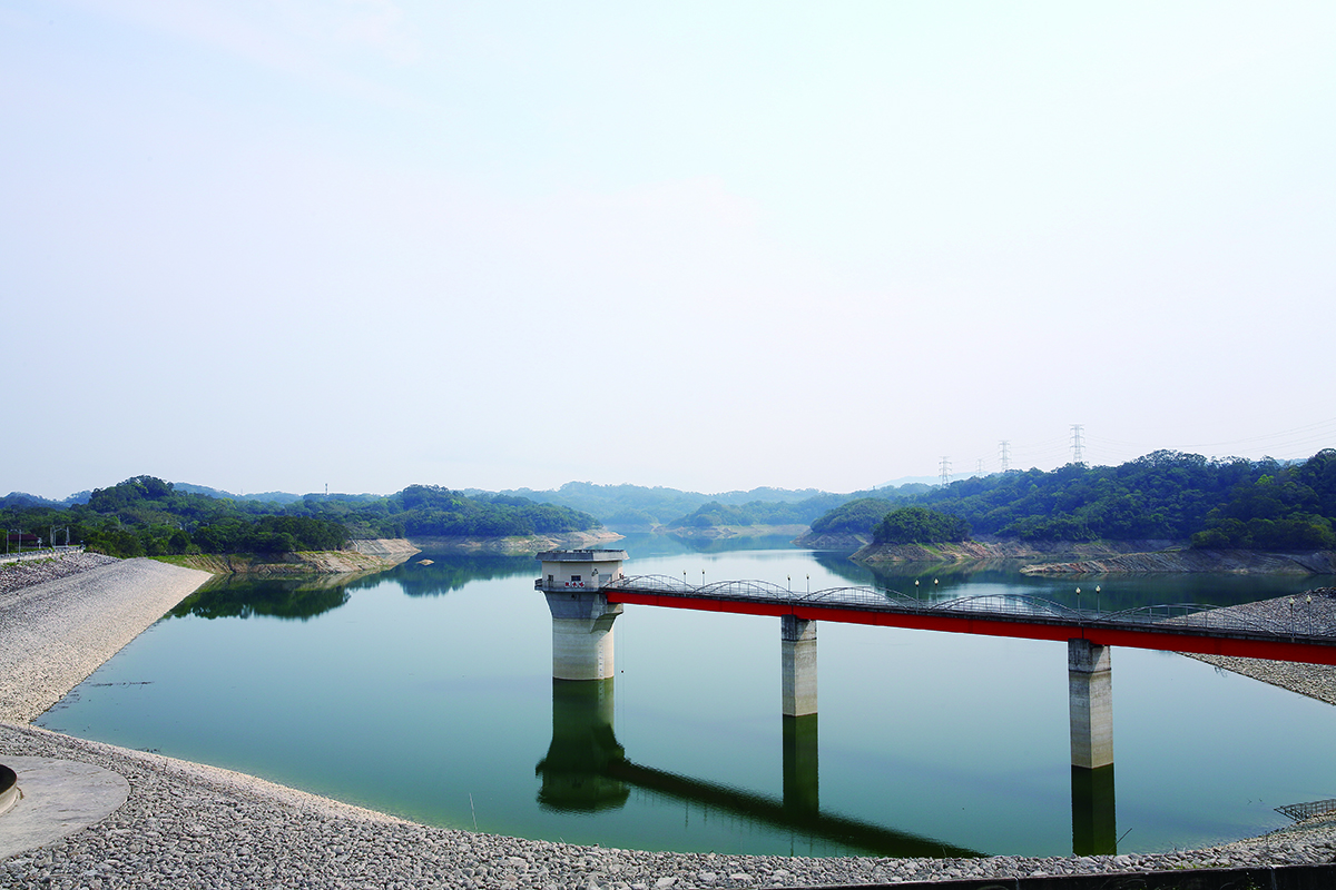 | 圖說33=寶山第二水庫的面積是寶山水庫的2倍多,站在觀景台上便覺相當開闊,通往取水塔的紅橋則為壩景增添色彩。 |