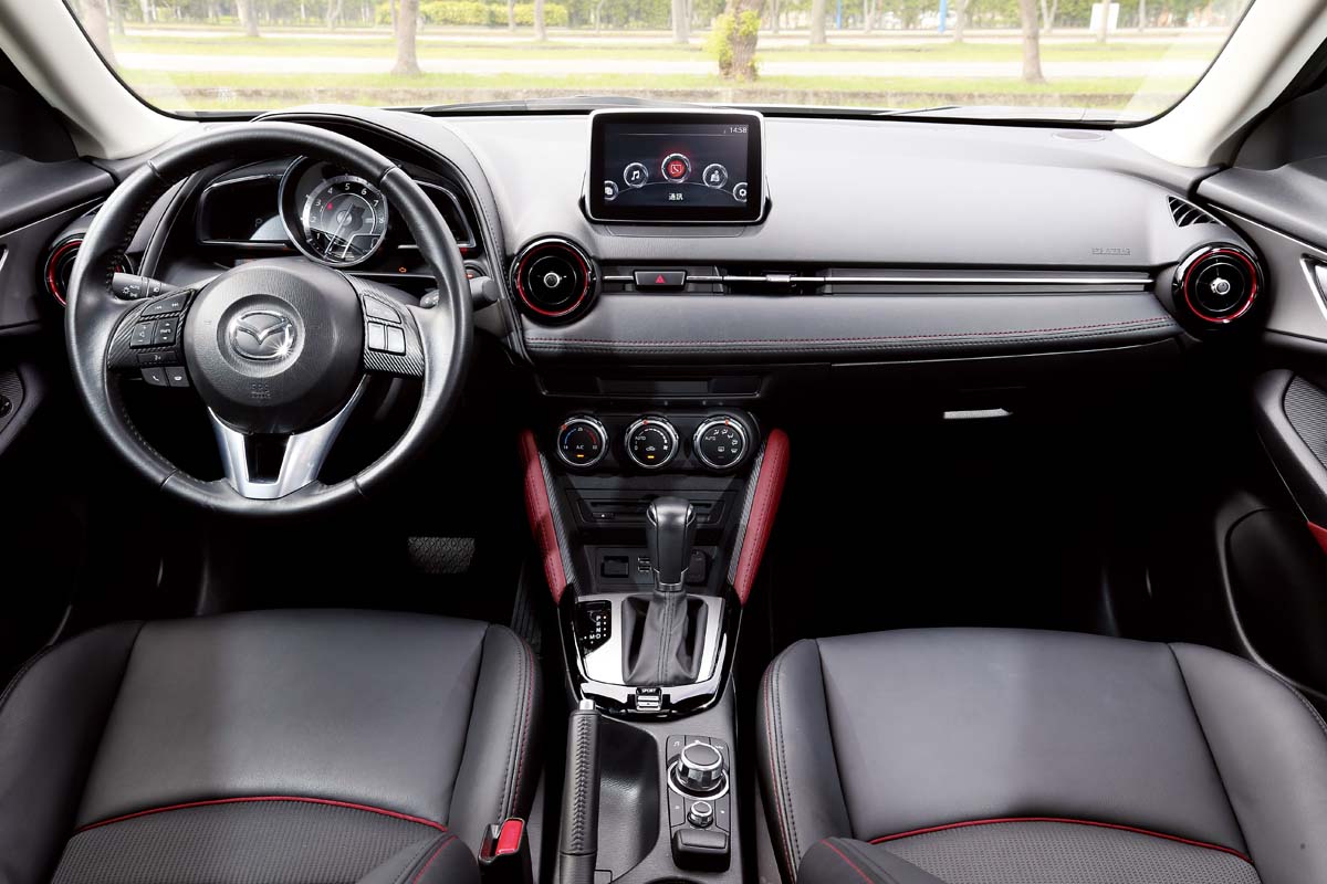 在內裝質感方面,CX-3與HR-V、C-HR有相似調性,車內皆以皮質包覆以提昇整體座艙質感氛圍,不過論及皮革使用範圍或是座艙設計,CX-3皆營造出強烈的高級感受,另外透過碳纖維飾板、紅色縫線、亮面烤漆與霧銀材質搭配組合,更進一步營造出運動氣息。