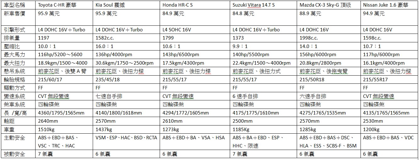 在經過各項目分析比較後,其中外觀與配備項目,CX-3僅些微差距從HR-V手中勝出,而在空間方面,Soul出色的表現展現驚人纏鬥力,但最終在相近水準下HR-V以空間項目獲得加分。動力部分,Vitara以1.4升渦輪引擎與四驅系統展現高人一等的實力,同時亦帶來讓人滿意的駕駛樂趣。最終HR-V在加入外觀評分後,因其於各方面皆有均衡表現而險勝,Soul與CX-3則是緊接在後,兩者若能在外觀與空間方面加強,相信結果會有所不同。