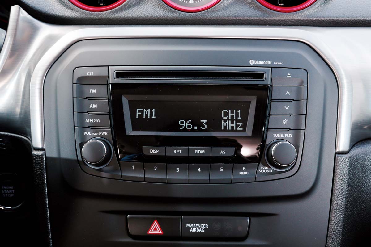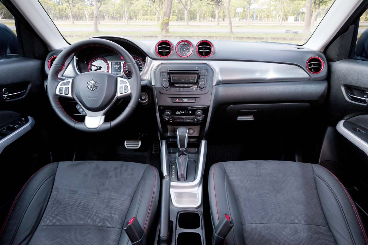 相較於多數對手採皮質包覆的內裝,Vitara以硬質塑料飾板鋪陳的座艙,於視覺方面便會讓人覺得不夠精緻,不過好在整體組裝品質仍有著不俗的表現,且仔細觀看後,儀錶平臺中央所配置的霧銀髮絲飾板具有畫龍點睛效果,而冷氣出風口更輔以紅色飾環點綴,進而在此級距中具有最鮮明的運動氣息。