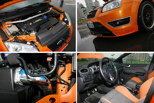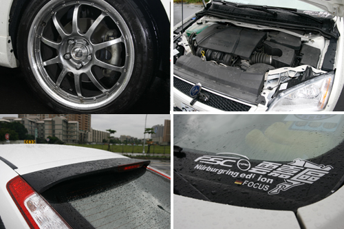 車主心得:車主阿和表示,他開這輛Focus已經三年多了,在動力方面並沒有太大的改裝,僅換上巨石中段排氣管、JS尾段排氣管,並配上Simota強化進氣系統與59mm加大節氣門,之後再改裝SCT電腦程式後,整輛車比起原廠時已有不同的感受,打開引擎室也看到車主的一些巧思,像是自行DIY製作的廢油氣回收筒與逆電流等。此外在底盤方面,這輛車也花了不少功夫,例如換上Koni避震器、前後AOE防傾桿、強化下支臂等套件,不過車主表示最有效果的還是NUTS滑動魚眼,裝上去之後過彎極限明顯的提高許多,而制動方面,原廠煞車制動力不足一直是為人詬病的一點,在此車上煞車卡鉗流用Metrostar部品配上加大碟盤,車主表示效果相當不錯,適合預算有限的車主流用。