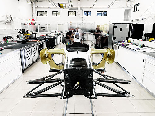 到了第二天,車子看起來就不再像是個只裝上懸吊拉桿的大型碳纖維塊狀物了,這時的外觀比較有流線動感,這天會有更多的噪音:較少檢測組件,而較多使用吵雜的動力工具以及重型設備,隨著引擎、變速箱、後懸掛以及後尾翼都送回來之後,就把它們用螺拴鎖上去,現在看起來就真的開始像一輛賽車了,這時你會發現自己也想找支扳手│你也等著想要參與工作。