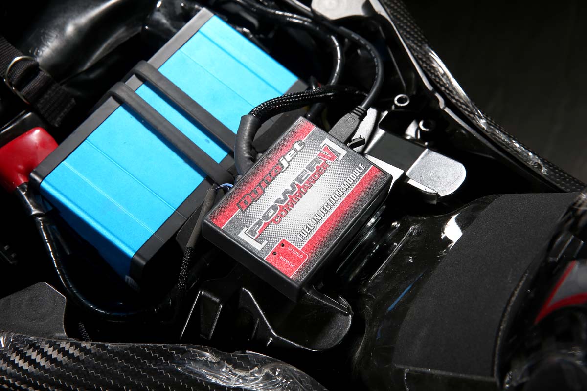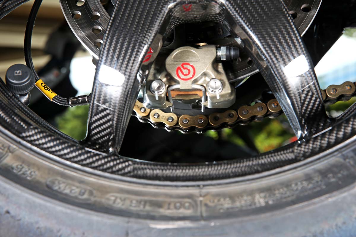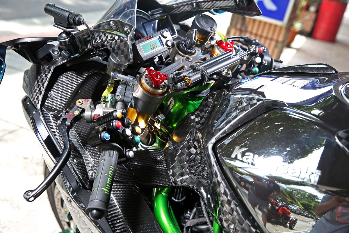 動力部分更是讓人著迷,除了已經將原廠封印解除還不夠,Fast Bike駿哥則是透過CNC四喉進氣口,搭配美國加大增壓普利套件,一舉將增壓值由1.3bar提升到1.7bar,為了搭配上更高的增壓值,排氣系統當然不能馬虎,AR訂別訂製的鎳鉻合金頭中尾段完全直通化,並且搭配PC5+MAP選擇開關重新撰寫供油,在馬力機上做出將270hp(淨)的出力,不過由於機械增壓的出力太靈敏,對於這輛馬力重量比不到1的H2來說太過狂暴,為了確保車輛整體的耐用度,Fast Bike駿哥則是透過空燃比的下修,將動力修正到250hp(淨)左右。