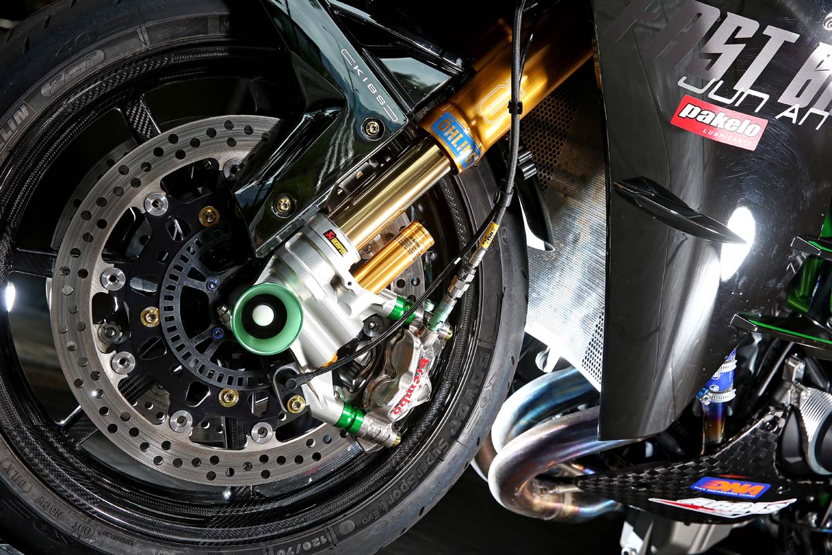足下部分更是看的小編口水直流,Ohlins FGR200外掛氮氣瓶前叉+ TTX36 GP後避震提供車主更Q的路感,而煞車系統更是相當詭異,不知從何流出的Moto GP廠隊卡鉗及煞車總泵全都出現在這輛H2上。