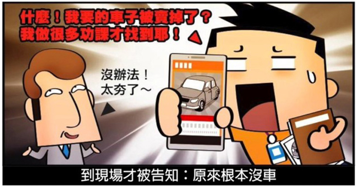黑心車商用各種手段誘惑消費者到賣車的現場來,但結果沒有車。更惡劣的還有詐騙訂金的行為。