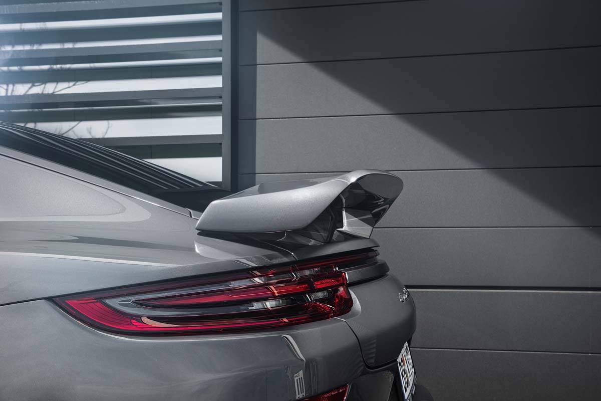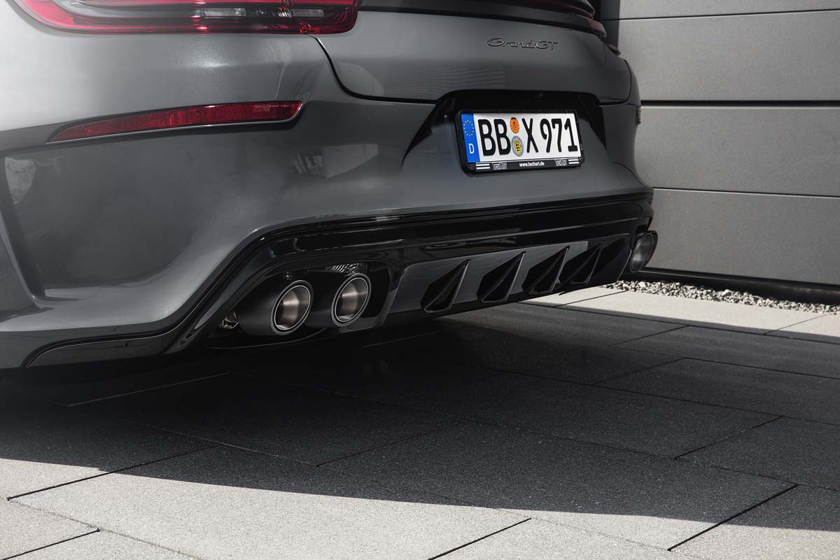 雖然TechArt預計今年下半年後才會向「動力」操刀,不過引擎蓋全由碳纖維打造,兩條突出的線條增加車頭的運動風。在車尾下方的後分流器採用四支獨立的鰭片設計,並且跟包覆著碳纖維的鈦製排氣管相連,附加上方的尾翼,乍看之下很像911 GT3,只不過它是四門車。至於輪圈當然用自家品牌的Formula IV 22吋鋁圈,五福雙肋條式的黑鋁圈之外,車主也能選配其他顏色來搭配卡鉗。