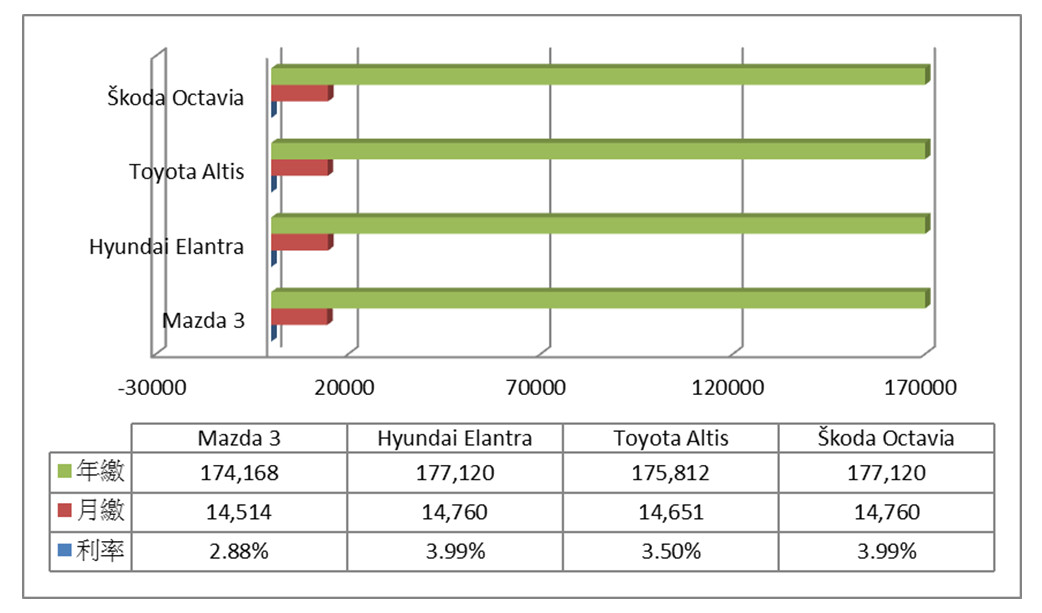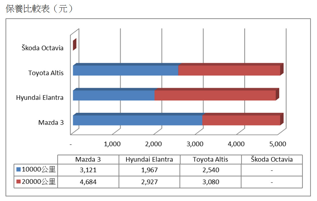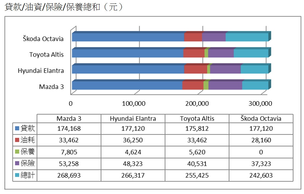 透過各項數據的分析,最終結果呼之欲出,由Octavia毫無懸念的大幅勝出。首先在貸款方面由Mazda 3些微領先,但到了油耗部分Octavia以出色的17.4km/L數據鶴立雞群,低油耗的絕佳表現在每年2萬公里的計算下,是四部車中唯一油資低於3萬的車款,每年3~6,000元的差距,長期下來也會是一筆可觀的差距。在保養方面,雖然Octavia享有4年3次免費保養的專案,但之後每1萬5千公里保養費用為10,210元,反而超過Elantra的4,624元,在此項目國產車親民的價格優勢明顯勝過進口車,也是特別需要注意的重點。