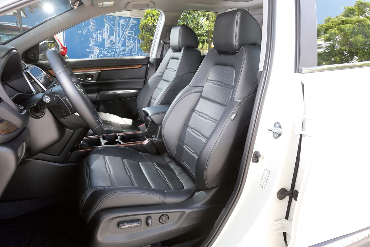 全新CR-V的內裝設計與外型一樣給人煥然一新的感受,不過整個佈置格局與風格依然是十分穩重與大器,但最大的不同點就是多了一份科技感以及原廠所強調標榜的內裝質感氛圍。的確,上代車型的內裝由於硬塑件用料較多,因此車室質感表現較受人微詞,不過新CR-V在這部分確實有了大幅度的精進,除在中控檯鋪設大量的軟質塑料外,方向盤與座椅所使用的皮革質地也相當細緻,同時更以鍍鉻金屬件、黑色鋼琴烤漆飾板以及核桃木紋飾板等運用搭配,而營造出令人相當讚賞的內裝質感氛圍。
