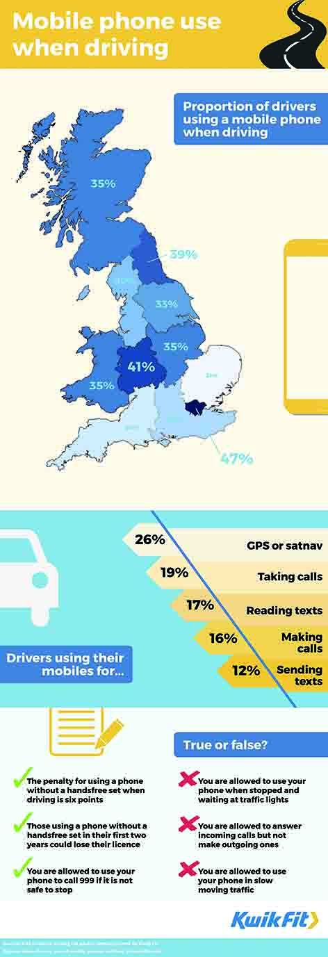 根據英國研究,儘管政府、警方大力宣導開車使用手機的危險,卻仍然有三分之一的英國駕駛會在開車時使用手機,目前大約還有34%的使用者沒有使用手機架,約四分之一的人邊開車邊用導航,甚至有八分之一的人坦承會一邊開車一邊傳簡訊或是訊息。研究也指出最容易忽視這些規則的人大多數為18~24歲的年輕駕駛者。