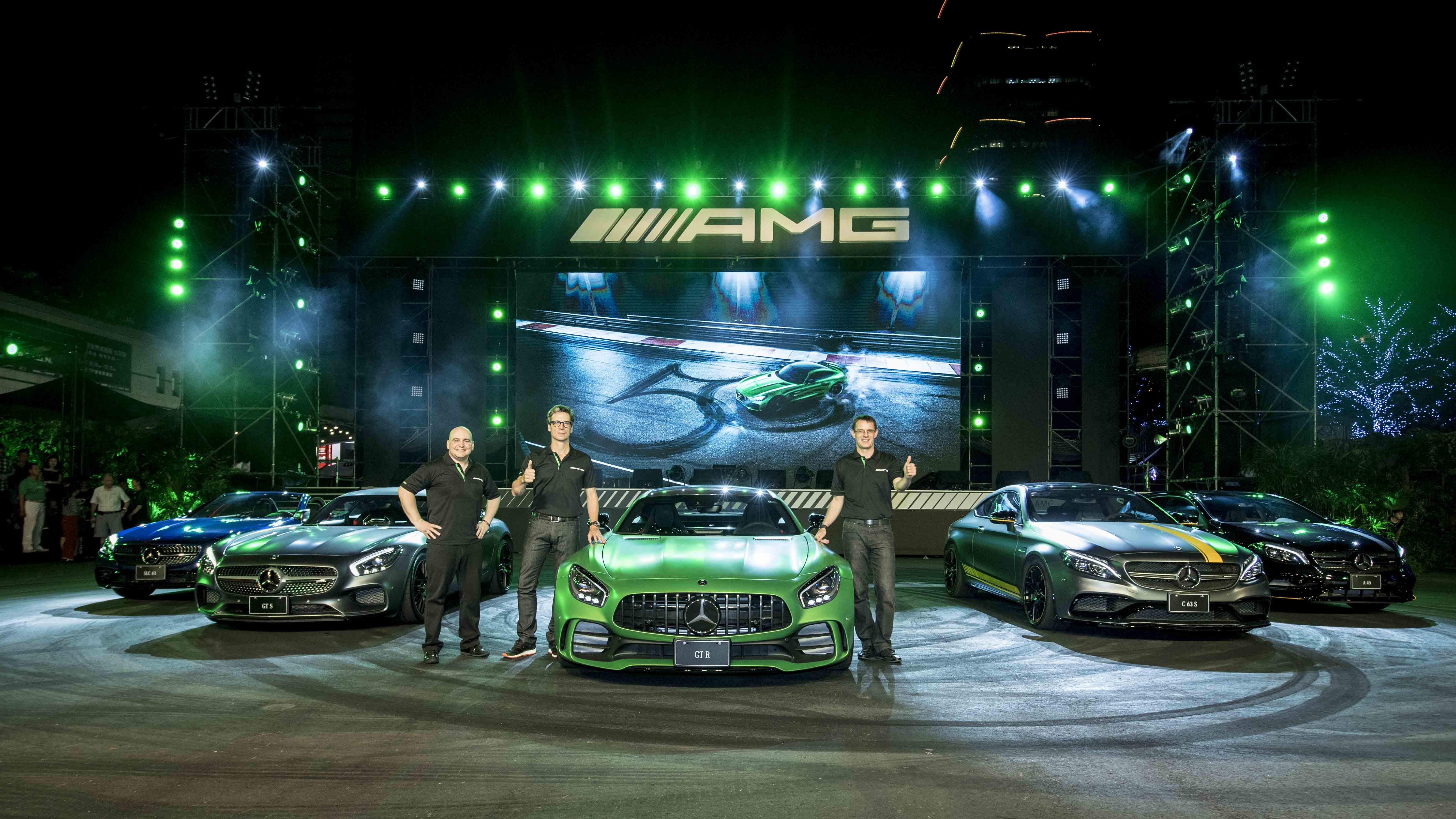 | Mercedes-AMG 50週年性能盛典,綠色猛獸AMG GT R在性能大軍簇擁下,與左起台灣賓士行銷業務處副總裁Markus Henne、德國原廠Head of Sales AMG Patrick Marinoff、台灣賓士總裁Eckart Mayer合影。 |