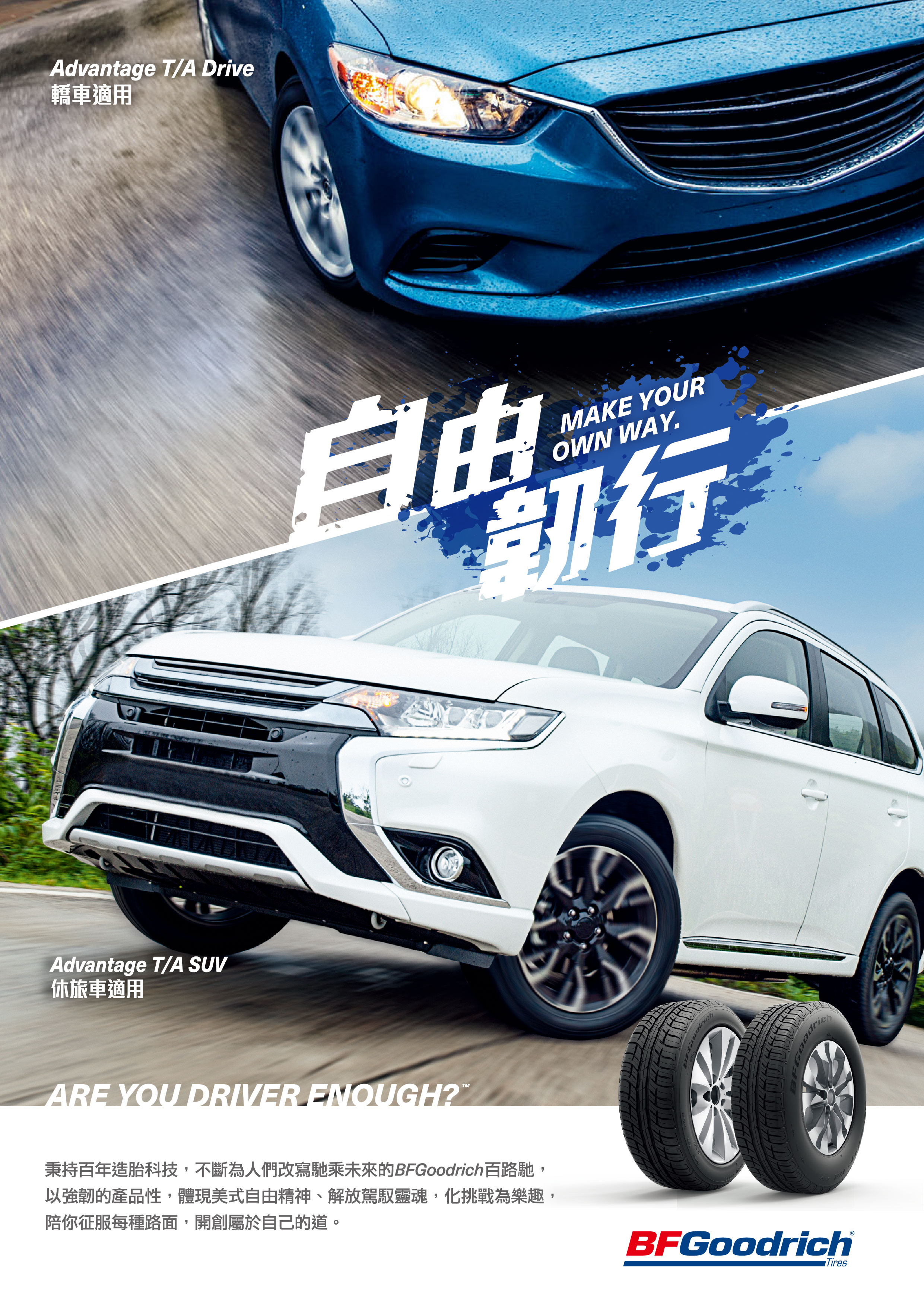 看好國內日漸龐大的SUV車口數所帶動之輪胎消費需求,BFGoodrich將以獨特的品牌形象和堅強產品實力,為不同客群的消費者提供一系列最值得信賴的產品組合,無論是一般街道與都會使用者、嚮往大自然喜愛輕度越野的陽光車主,還是熱衷挑戰泥濘地形的專業級越野玩家,BFGoodrich都能全面滿足不同型式SUV車主們多樣化的輪胎使用需求,同時為顧客打造出「Make Your Own Way自由韌行」的絕佳駕馭體驗,解放潛藏於心中的探險靈魂!