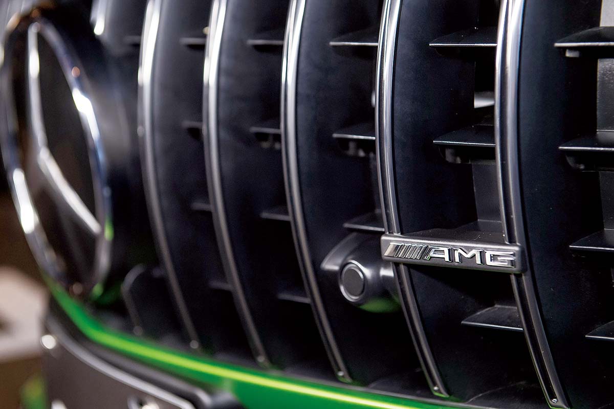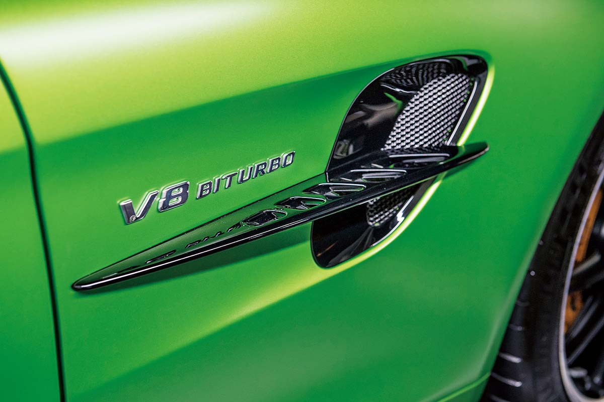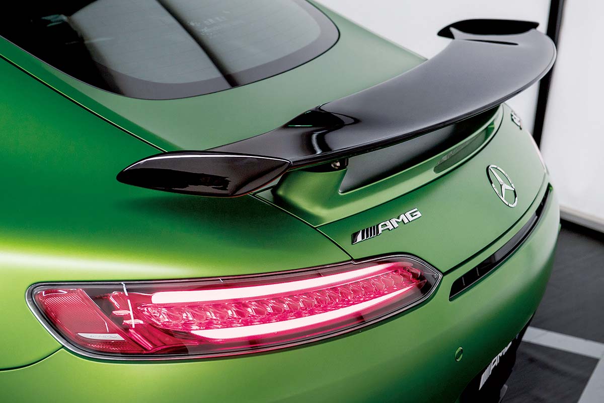 有史以來Mercedes-AMG最強的性能猛獸出閘,挾帶紐柏林賽道7:10.9單圈紀錄的威名,在今年7月正式登陸國內,它就是AMG GT最強的性能之王──AMG GT R。身披專屬的紐柏林消光綠車漆,搭配源自300SL經典的 Panamericana直柵式水箱罩、輕量化碳纖維寬體前葉子板(較GT/GT S車型加寬46mm)、AMG主動空氣力學進氣格柵與前下護板(對應車速可自動調降最多達4cm,於時速250km/h時可增加額外40kg下壓力)、碳纖維車頂、碳纖維車外後視鏡罩。車尾配備大型可調式碳纖維尾翼、寬體後葉子板(較GT/GT S車型加寬57mm)、輕量化碳合金消音器,與中出排氣系統結合側邊雙出隱藏式尾管,光是外表就足以震懾人心。