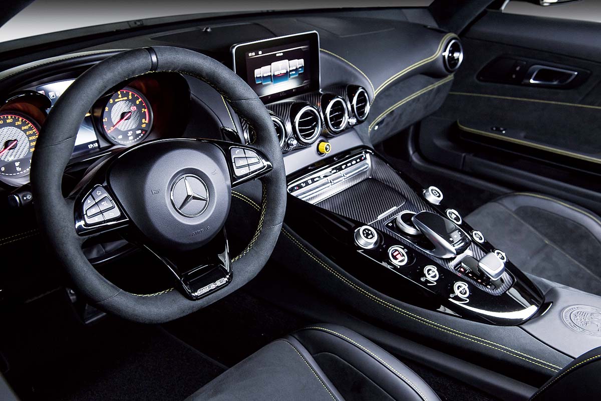 GT R的駕駛介面換上了高性能DINAMICA平底方向盤,搭配AMG高性能賽車座椅、橘紅雙色儀錶板、AMG霧面碳纖維控檯飾板、AMG碳纖維門檻飾板,將熱血與豪華分子完美融合。此外,GT R同時提供AMG賽道套件作為選配,包含輕量化AMG賽車桶型座椅、SCHROTH四點式安全帶、滅火器與霧黑色防滾架,讓車主更能將GT R發揮到極致。