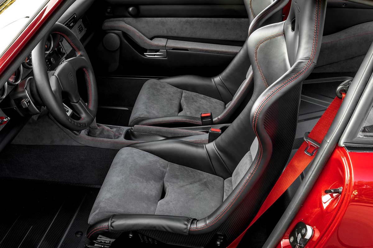 內裝部分映入眼簾的就是兩張由Gunther Werks套別打造的碳纖維賽車椅,後座也直接被大量的碳纖維製品取代乘坐位置,內裝則是可依照車主喜好,在皮革顏色、車縫 線配色做自由搭配。車體塗裝Gunther Werks準備了18種顏色,當然如果沒有喜歡的車主也能另外下單,只不過差價部分則是需要自行吸收。