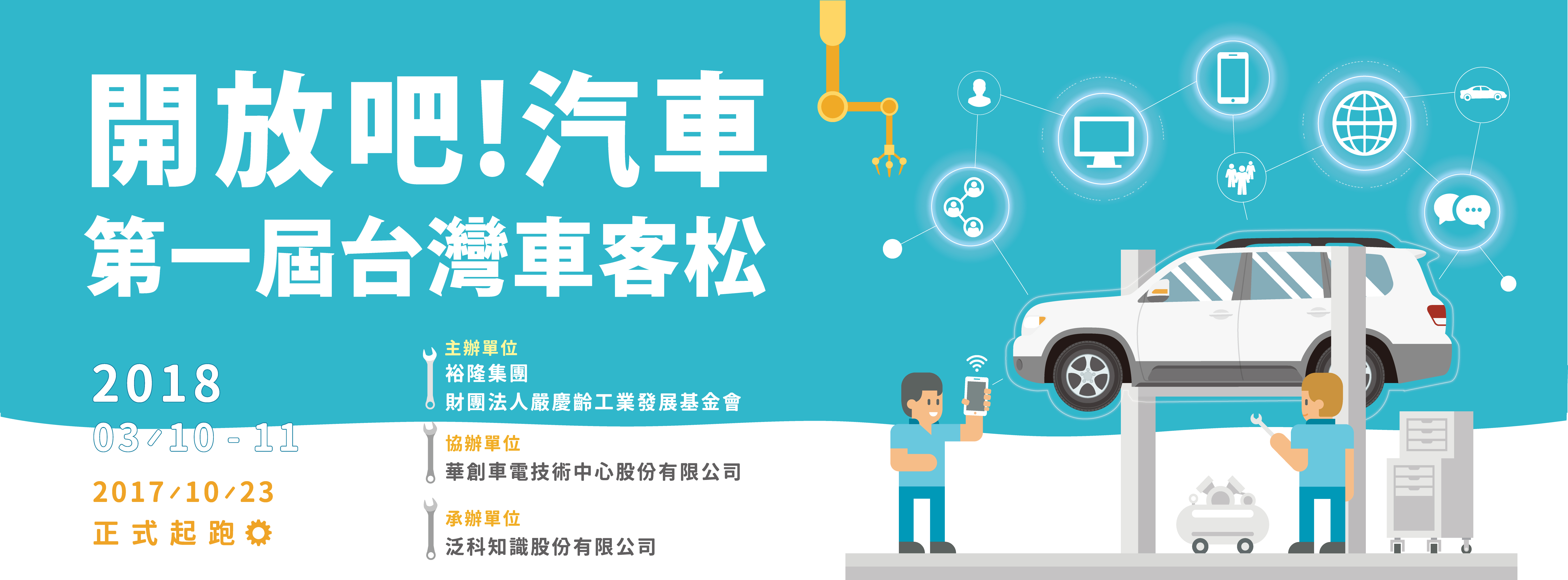 在你的內心是否也有一個未來汽車夢,渴望動手實踐與打造?裕隆集團以台灣唯一自主整車研發平台,期望集眾人之智慧,解決台灣車輛交通的共同議題,打造更貼近與符合台灣人用車習慣與道路環境的汽車,攜手嚴慶齡工業發展基金會共同主辦,與華創車電與最大科普知識社群泛知識,打造汽車科技創新自造平台,興起台灣車客松活動,邀請年輕團隊加入台灣自造車行列。首屆車客松活動以<開放吧!汽車>作為主題,以整車平台x創客精神為核心,鼓勵參賽團隊以大膽、開放的創意發想,以汽車為主題,自由提案構想,透過黑客松的競賽方式與系列前導課程,提供參賽團隊在競賽中動手實踐創作,與台灣各領域創新創意人才,在台灣首次為汽車主題搭建的車客松平台上,互相觀摩、交流,共同激發自造、創造、改造,發掘台灣未來汽車夢想續航的新動力! <開放吧!汽車>台灣車客松活動於今日(10/23)起跑報名,裕隆集團與嚴慶齡工業發展基金會,歡迎對未來汽車有想法的年輕團隊組成跨領域團隊報名,總金額百萬獎金等你來挑戰! (報名資訊請參考活動網址: http://carmaker.panmedia.asia/ )