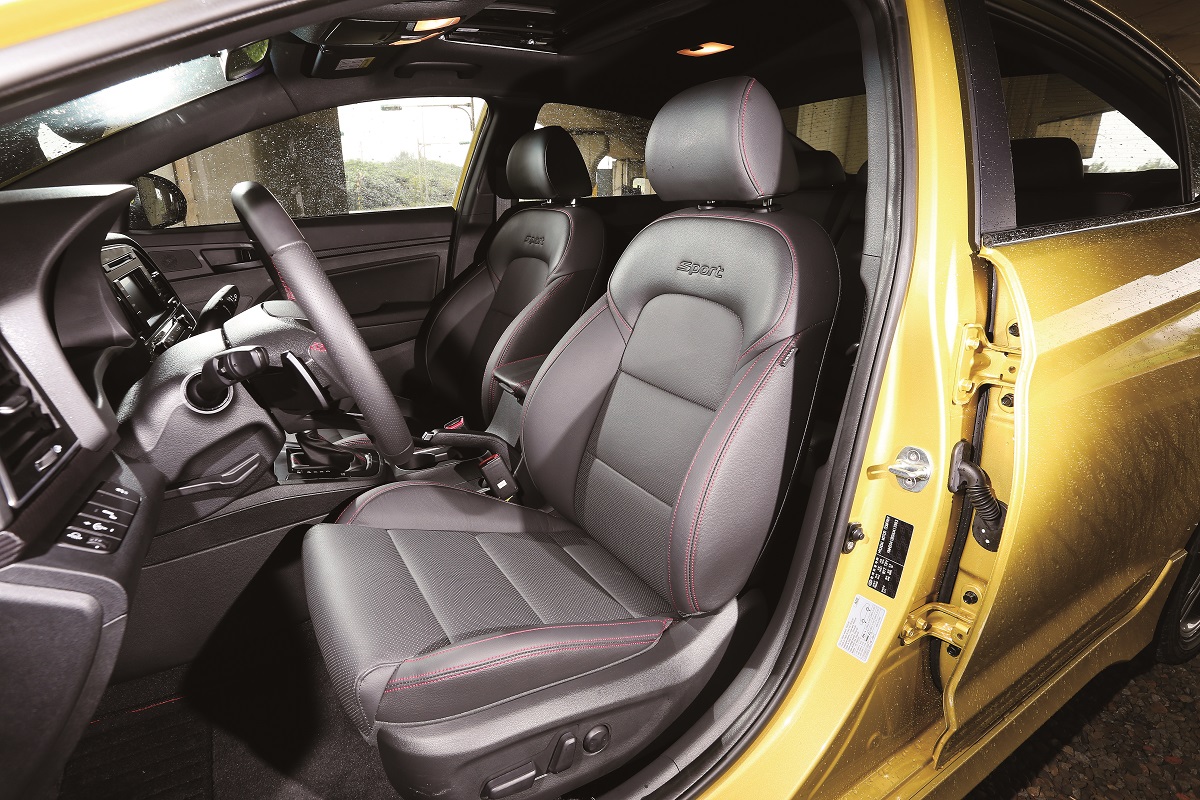 至於駕駛艙的設計,中控與儀錶總成還是維持現有型式,但是換上了全新的雙環式自發光儀錶板,車內也多了紅色縫線、Carbon花紋的內裝飾板點綴熱血運動的氣氛,至於效果如何就見仁見智。Elantra Sport內裝最大的變化就是導入了全新的方向盤及跑車座椅,源自Ioniq的平把式方向盤不僅有著不俗的握感,看起來也和性能非常對味,搭配換檔撥片的設計,都可以帶給駕駛者充滿戰鬥的氣息。全新的Sport-Line紅色縫線皮革跑車座椅,椅背上還印有Sport字樣突顯身分地位,當然包覆性與支撐性比起一般版本車型,也有著不小的提昇,但就一部性能車款而言,似乎還是有著些許升級的空間。