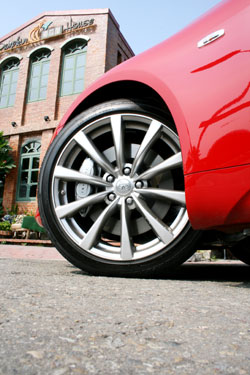 | 十幅式19吋鋁圈搭配前225/45、後245/40跑胎,以及前四後雙活塞卡鉗+大徑通風碟的運用,不難想見G37 Coupe在操控上所下的功夫。 |