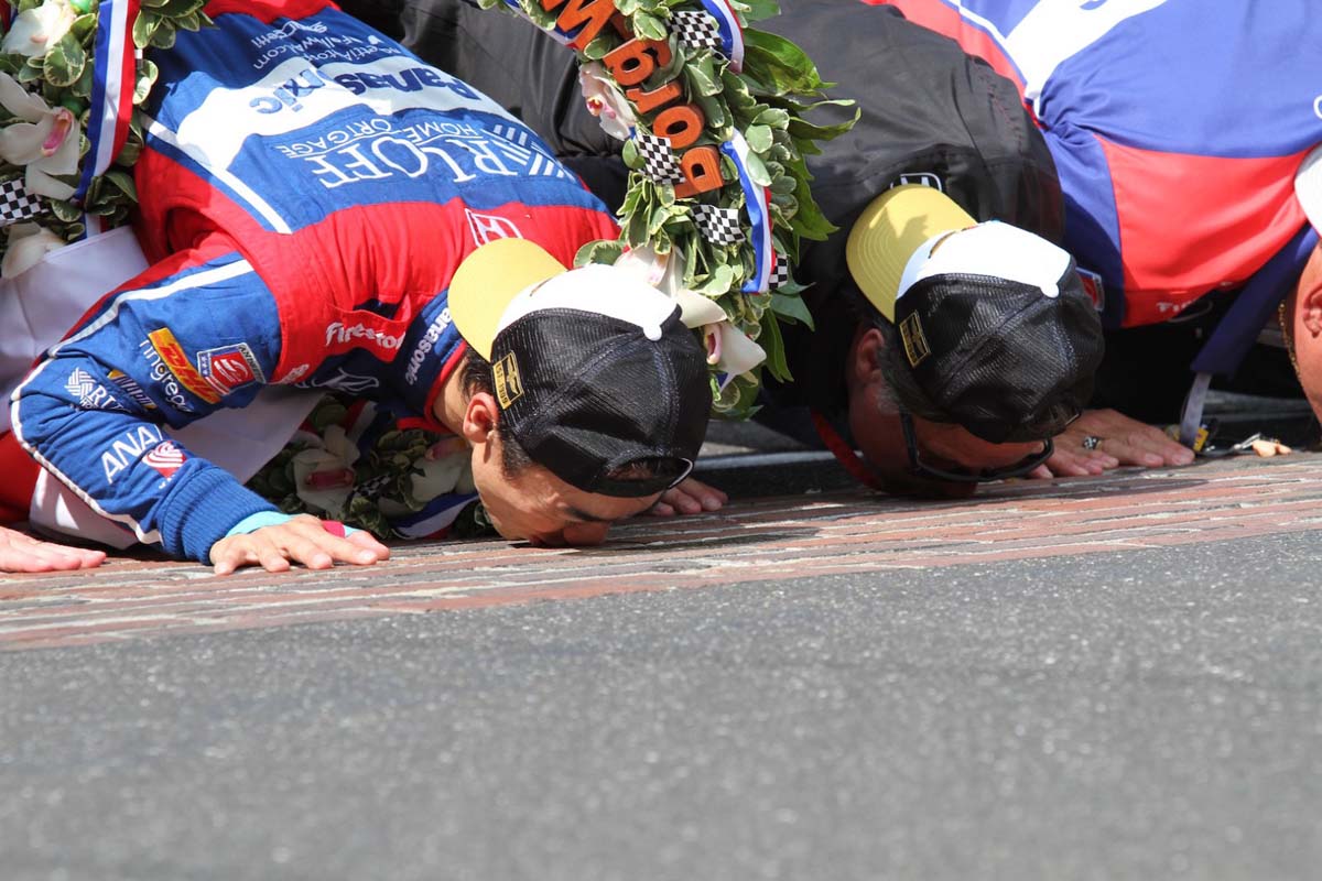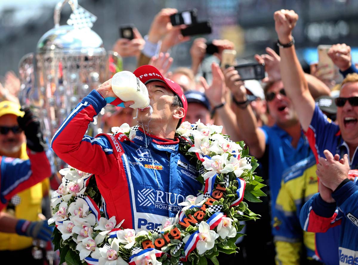 冠軍不僅戴上充滿榮譽的花環,還以牛奶取代香檳,也是全球唯一喝牛奶慶祝的賽事。而佐藤琢磨是前F1車手,今年轉戰Indy 500就拿下冠軍,按照傳統,冠軍隊伍要親吻終點線的紅磚道,以紀念最早由紅磚鋪陳的歷史。
