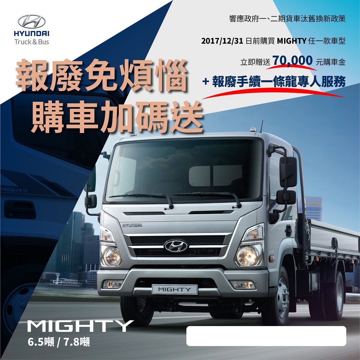 為響應環保署一、二期老舊大貨車註1汰舊換新政策,即日起至12月31日止,凡購買HYUNDAI Mighty全車系任一車款,即可立即享有7萬元購車金註2,並由HYUNDAI汽車提供全套補助申請服務,協助客戶免去辦理報廢手續的繁瑣細節,機會難得錯過不再。