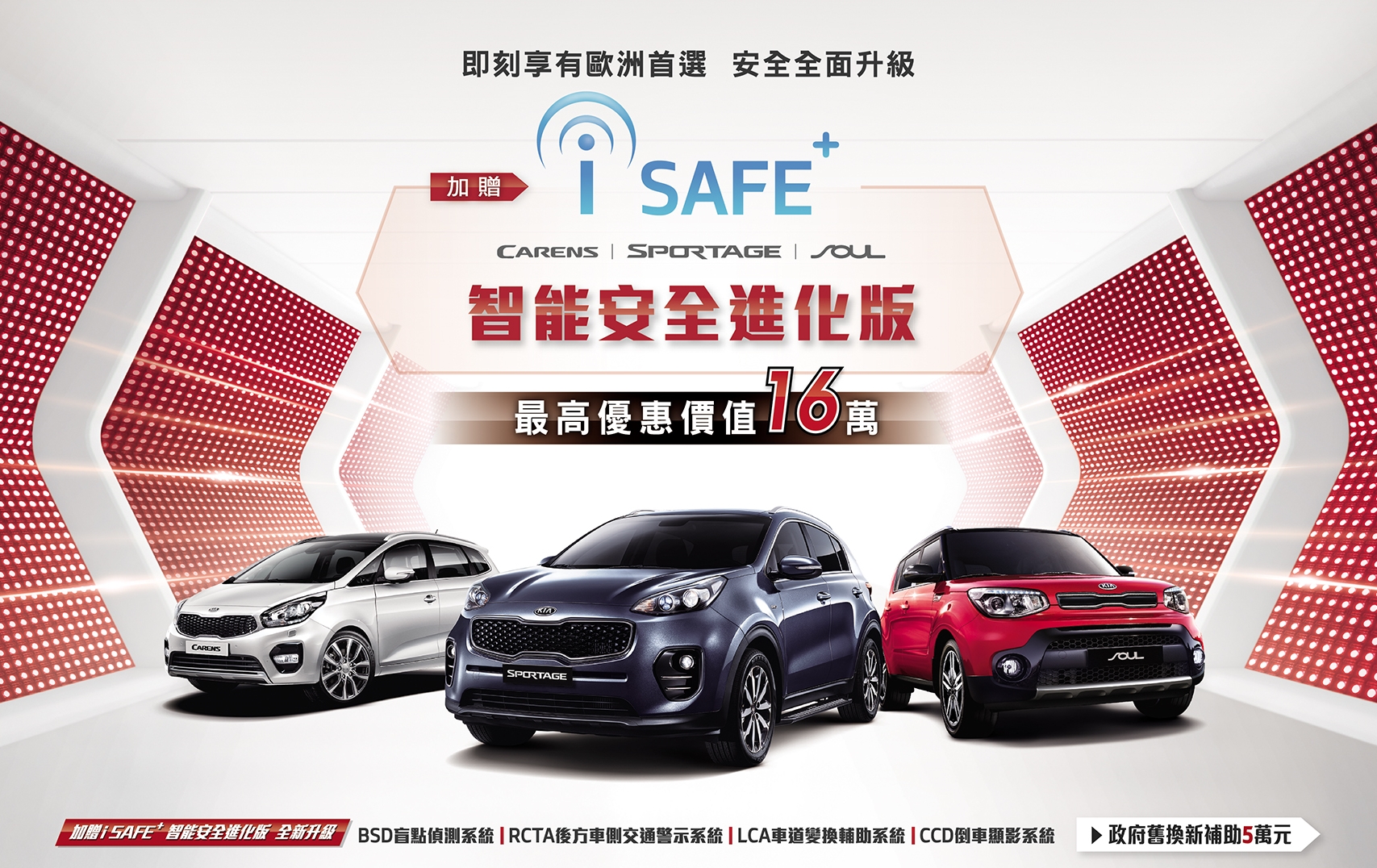 由森那美起亞為台灣導入的新世代KIA,自車體設計與打造開始,即以安全為最高準則,只為提供車主與乘員一個更安心的乘車空間,更放心的駕車體驗。KIA台灣總代理森那美起亞更積極爭取,全車系提前對應交通安全法規要求,搭載TPMS(胎壓偵測系統)、VSM(車身穩定管理系統附方向盤轉向修正)、ESC(電子車身穩定系統)、HAC(上坡起步輔助系統)、ABS(電子式防鎖定煞車系統)、BAS(煞車輔助系統)等完整主被動安全配備,提供所有KIA車主無需加價選配即可擁有的全方位安全保障。本月(即日起至11月30日止)更特別推出i SAFE+ 智能安全進化版優惠方案,免費升級BSD盲點偵測系統、RCTA後方車側交通警示系統、LCA車道變換輔助系統,以及CCD倒車顯影系統,為有意入主最強勝利組MPV──KIA Carens,擁有業界最強七年不限里程保固,市場唯一百萬即可入手的進口柴油跑旅──KIA All-New Sportage,以及1.6公升柴油渦輪新動力酷玩潮車──KIA Soul等指定車款準車主,再加強化的主被動安全配備,整體優惠最高可達16萬元!