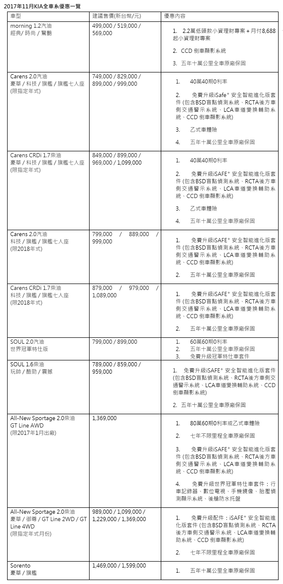 KIA品牌擁有來自北美、歐洲各國際權威獎項認證,在台灣,總代理森那美起亞更有母集團堅實資源,以及台灣商界經營的榮耀肯定,提供台灣購車族群,一次滿足設計、安全與操控性能的嶄新KIA車款。11月底前購車領牌,免費升級KIA i SAFE+ 智能安全進化版,為您的愛車及您所愛的人行車、乘車安全提供更完整的保護。安全全面再升級,即刻享有歐洲首選汽車品牌輕鬆無負擔!歡迎親臨KIA全台各展示中心賞車或預約試駕,實際感受國際權威及歐美眾多車主及權威機構肯定的新世代KIA車款。詳細優惠辦法請洽KIA全台各展示中心或KIA官方網站:https://www.kia.com.tw/