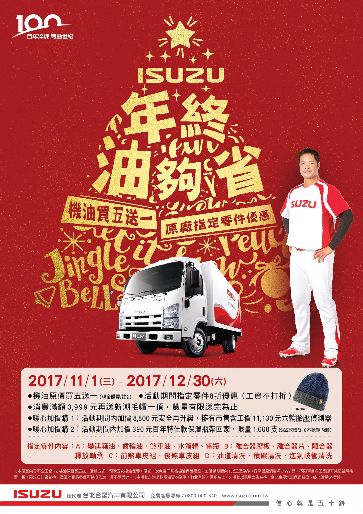 ISUZU年終油夠省健檢活動自11/1(三)開始起跑至12/30(六)為止,除了上述機油買五送一優惠外,原廠指定零件亦提供8折優惠(指定零件:A-變速箱油、齒輪油、剎車油、水箱精、電瓶; B-離合器壓板、離合器片、離合器釋放承軸;C-前煞車皮組、後煞車皮組;D-油道清洗、積碳清洗、進氣歧管清洗,工資不打折),以上消費凡滿額3,999元將再加送新潮毛帽一頂;此外,為回饋廣大車主,亦有兩項暖心加價購活動: