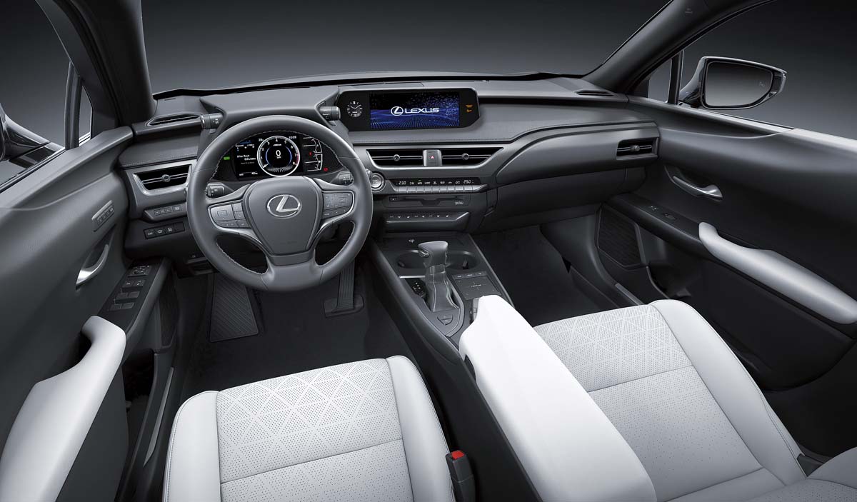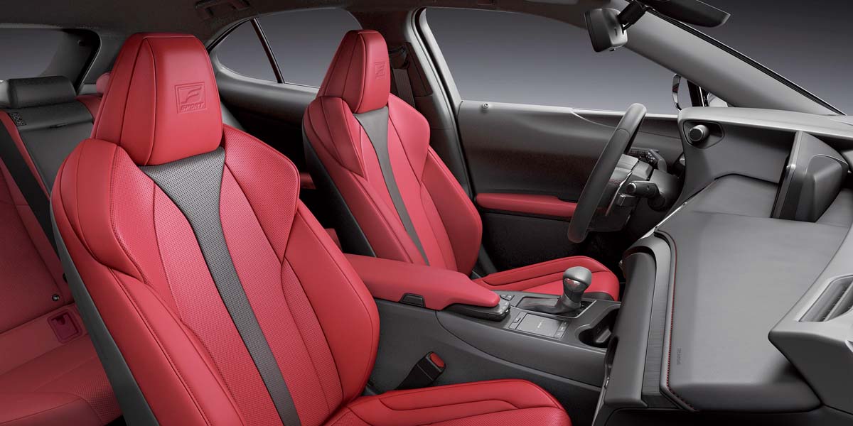 量產版UX的內裝鋪陳同樣以家族風格辦理,從控檯上的彩色液晶螢幕、空調控制介面到排檔座上的Remote Touch與觸控手寫版,都是令人熟悉的家族特色設計;另外,包括單環式數位儀錶以及在儀錶上方設置循跡控制與動態模式切換旋鈕等設計,更是沿襲新世代LS車系的佈置,當然一貫的日式精緻高質感用料自然也不再話下。此外,從釋出的內裝圖片也能看到一般標準車型與F Sport運動版車型的差異,前者搭配白色座椅來強調豪華質感,後者則是配置紅/黑雙色皮椅,並在方向盤及排檔桿等處施以紅色車縫線,來營造更熱血的運動氣息。