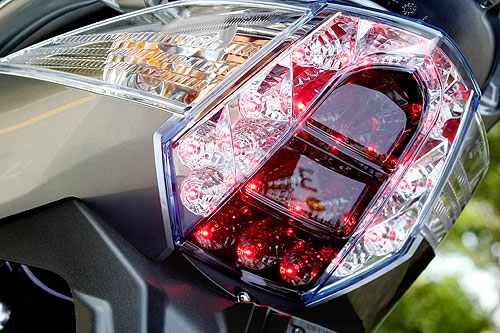 | 雖然車友戲稱中央燻黑部分很像貼上「海苔」,但點燈(透明ㄇ字外環處)與煞車燈(中央燻黑處)分工的概念,乃國產機車LED尾燈首見。 |