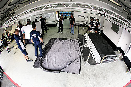 在Williams車隊,打包工作是從休停站車道上開始,首先拆除的是休停站的布條和牌子,接下來是休停站護牆上的檯架和桌椅、以及車庫裡頭的牆面看板,這些工作由車輛技師們分工處理:負責車頭工作的技師拆除檯架桌椅、負責車身工作的技師拆除布牌看板,這些設備都還不需要什麼技術性,因此就將它們裝在對應的箱子裡(總計40箱),然後放進停在休停站車道上的DHL大拖車、準備直接運往下一站─匈牙利的布達佩斯。