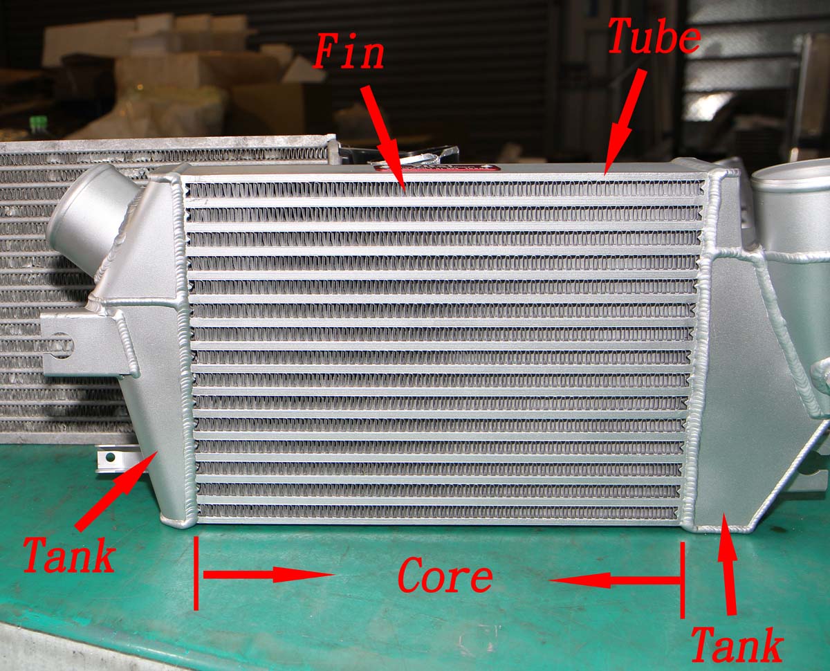而經由上述兩部分不斷重疊一起,直到10~20層的結構物,則稱為Core,這部分也就是所謂的「中冷器主體」。另外,為了使來自於渦輪的壓縮氣體在進入Core前,能有緩衝及蓄壓的空間,及出Core後能提昇空氣流速,通常都會在Core的兩側,再裝上名為Tank的零件,其外型就像「方形漏斗狀」,其上還會設置圓形進出口,以方便連接矽膠管。而中冷器就是經由上述四個部分所組成。