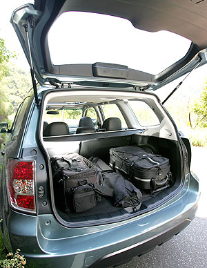 | 拜新型後雙A臂懸吊設計所賜,New Forester的行李廂載物空間可輕鬆容納本刊攝影顧爺所隨身攜帶的機絲行李。 |