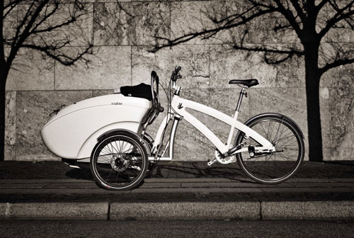 Triobike採用Shimano Nexus七段內變速系統,前輪機械式碟煞、後輪倒踩式煞車系統,兒童手推車配有通過碰撞測試的五點式安全帶,可乘坐0~9歲的小孩兩位,內藏管線式獨立手煞車及可拆卸式遮陽棚,是第一輛通過所有丹麥安全測試的親子型自行車。兩個獨立車體組合或拆裝時,不須使用額外工具,即可輕鬆在短時間內完成,多功能延伸使用是其一大特色。