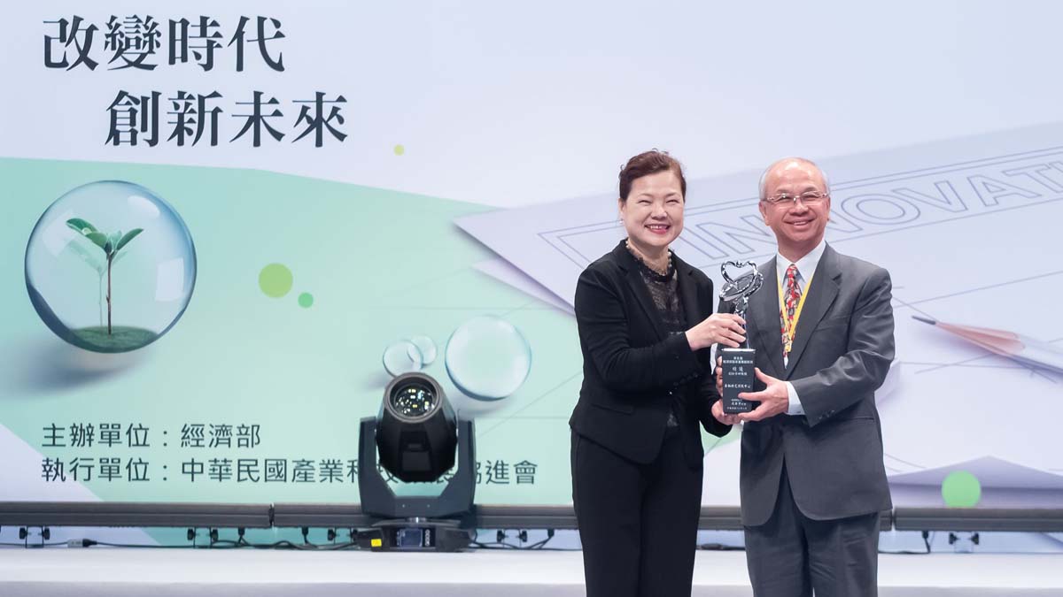 車輛中心榮獲第6屆「經濟部國家產業創新獎–績優創新學研機構」,由董事長陳昭義(右)代表接受由經濟部次長王美花(左)的頒贈。