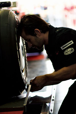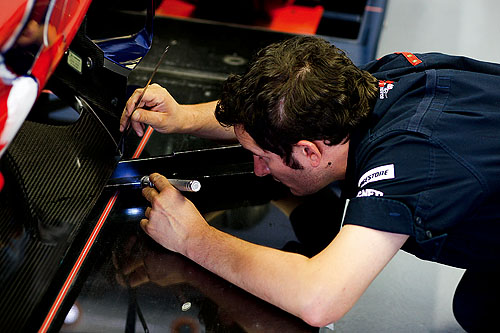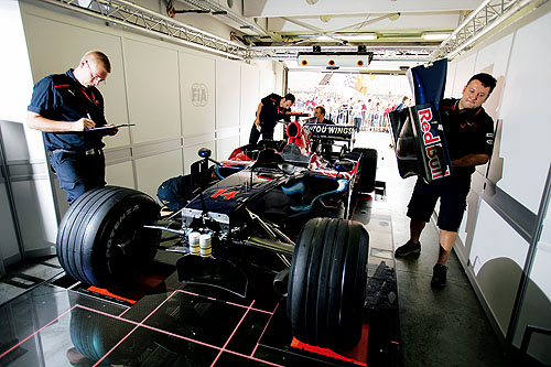 匈牙利大獎賽,Toro Rosso車隊的一名人員正在監看技術小組檢查Sebastien Bourdais的STR3賽車的重量以及度量。左下圖:一名Toro Rosso技師使用一種金屬測量儀器,以確定車架底盤合於FIA規則。 |