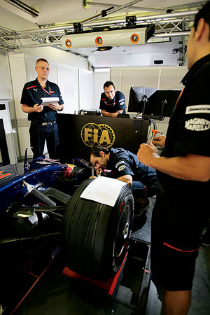 本刊進入車庫的時候,Sebastien Bourdais的Toro Rosso賽車正好就擺在這台惡名昭彰的橋架上。每輛F1賽車的底盤上都標有三處記號,這三處記號就在過磅時對應三個感應器以定位,然後四個輪子放在氣壓板上秤重;裝置的表面上有好幾條線、以標明車子各處長寬的最大限度,這輛STR3賽車必須完全在這些線條之內,同時還為各部突出的零件設計了標準化的金屬測量儀器,假如車身有任何地方超過它,車隊便知道他們有麻煩了。
