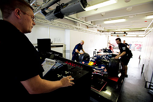假如一場比賽週末發生了任何麻煩,那麼就是從這裡開始,位於休停站上方的監察室,就是嚴格執行F1複雜技術規則的地方,這裡的負責者是一名身材魁梧的德國人Jo Bauer,你絕對不會想找他麻煩,他有權利決定任何車隊的生死。