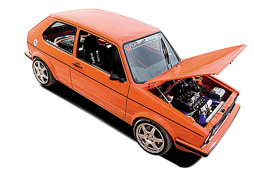 把這輛戰神紅的一代Golf停在拆解完畢的廢棄鐵堆之間,很容易會讓人以為這只是另一輛報廢的VW,只有眼睛最銳利的狂熱分子才會注意到它的8×16吋Speedline賽車鋁圈、以及六根輪輻裡面所隱藏的移植Hi-Spec高規格大型煞車,但是當你將引擎蓋以及尾門都打開時,就非常有趣了:前面是一具四代Golf GTi的心臟、後面則是來自Audi A3,動力經由一對Corrado G60五速變速箱來傳輸,這兩具變速箱經由手工特製纜線系統連接在一起、以合併兩具引擎的動力。