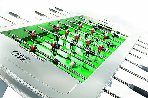 足球桌外框以白色且能散發光澤的金屬滑面飾板製成,不僅耐用度增加,所產生的色澤變化也令人驚嘆,桌面則採實際足球場上的綠色草皮鋪置,臨場感百分百,尺寸大小更是適合擺放於客廳。這項產品雖然耗費Audi設計團隊超過一年的時間設計、構思,但他們仍決定繼續製作此一系列商品。