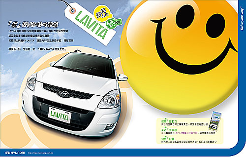 甫上市的現代Lavita以「微笑上市」命名,正符合現代人此時最需要的好心情。從車頭望去,一個開口微笑的表情正對著你,頓時也會讓心情大大的開心起來。
