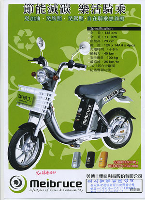 Meibruce電動自行車全長168cm、全寬71cm、座墊高73cm,電池使用規格12V×14AH×4pcs,充電時間約需6~8小時,續航力可達40km,且最多可載重100kg以內,最高速為25km/hr,並採用16吋鋁合金鋼圈,還有防盜警報功能。