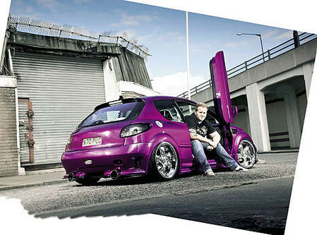 將車頂塗裝成黑色、並染黑前後水晶車燈之後,Iain讓他的206發揮了與紫色塗裝互相對比的雙色調車身效果。