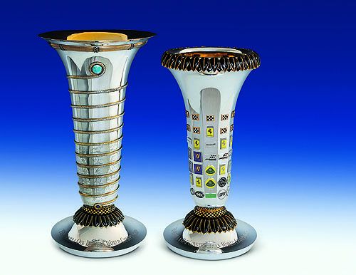 兩座獎盃的設計並不相同,但兩者都是由純銀所製,此合金包含了925的銀、以及另外75的銅或是其他元素。車隊獎盃的頂部和底部包覆了桂樹以及蓮花形葉片,葉子部分是將模具浸入銀器氰化池中電鑄成型,這種鑄造方式是透過電流來處理,這是一種源自19世紀的舊式流程,如今全英國只剩下三名銀匠還在這樣處理。獎盃的主體部分原本只是一大片銀質圓盤,將它放在車床上以做成圓柱形狀。車隊獎盃的各面都是平直的,因為要貼上每個得獎者的廠徽,「獎盃有十個面、以貼上十年來的冠軍車隊,往上每一層又都是一個十年,」Richard說:「我把車隊的廠徽貼在這裡,是想讓人看到明確的歷史紀錄。」兩個獎盃底座的「圈狀」方格環結合了賽車代表勝利的方格旗,而且還有一項聰明的設計:每個獎盃都可以一格一格轉動,讓新科冠軍可以剛好位於底座正面文字的正上方。車手獎盃比較高──大約高了2吋,而且底座稍大一點點──這是為了設計來容納100年的冠軍,「底部有一圈小小的藍色方鈉石,這代表宇宙,」Richard說:「然後桂樹的藤枝開始沿著獎盃本體向上螺旋蔓延,總共纏繞11圈、留下十行間隔,桂樹的枝線是鍍金材質,其中每行間隔容納十年的車手簽名,桂枝到了頂部又會纏繞成圓圈、內含一個琺瑯材質的地球──我將此詮釋為車手的渴望。」獎盃是由Richard與Bernie本人協同設計(『我們在他的辦公室瀏覽企畫,旁邊整整有四大疊紙……他真的凡事都喜歡親力親為。』),以往的冠軍車手是獲得一面直徑大約8吋的獎章,但Bernie認為那無法表現出車手錦標冠軍,「他想要更特別一點,想要真正反映車手和車隊的技藝。」Fox說道。全部手工製作、手工打磨、手工雕刻,光是刻完一座車手冠軍獎盃就需要三週的時間,因為上面有自從1950年Giuseppe Farina以來的所有簽名,整座車手冠軍獎盃的工時大約八週。當本刊到訪時,Richard和他的團隊身邊的這些獎盃是由馬拉涅洛(Ferrari總部)所訂製、還有一間瑞士的豪宅──用來充實Kimi不斷擴充的獎盃櫃,Ferrari訂了三座、Raikkonen訂了一座,「我們為Ferrari和Kimi各做一座車手冠軍獎盃、還為Ferrari做兩座車隊冠軍獎盃,我知道他們會自己留一座,但不知道另一座會放在哪裡,而製作這些獎盃總共需要大約八個月的時間。」Ferrari在歷經2007年的苦戰之後、訂做了這些獎盃,因為冠軍車手和車隊在FIA年終頒獎儀式受獎之後、還要將這些獎盃繳回──如果你需要永久留存(絕大多數都會這麼做),你就要再請Richard做給你(『我記得Jacques Villeneuve是唯一沒有要求另做複製品的。』),「沒有人可以保有最初那一座,我們會知道哪一座是原版的,因為上面刻有日期戳記浮水印。」「當我們拿回原版的獎盃之後,我們會重新整理、並打上新科冠軍的名字,然後於12月初送去摩納哥。我們偶爾會收到一兩次有刮凹痕的,或者是必須再拋光、以去除香檳痕漬的。」