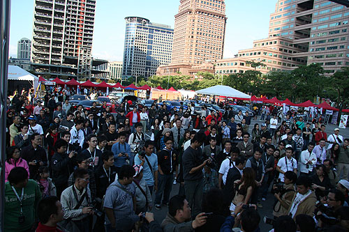 才到會師場地附近,就被如雷的音響吸引,每個經過的民眾無不停下腳步觀望,活動現場有如車展般壯觀。這幾天剛好冷鋒來襲,但是到了12月7日這天,一掃日前冷颼颼的天氣,讓活動得以順利進行,與會車友暴增,主辦單位刻意在派對開始之前,安排了幾部勁裝Audi,並且由兩部敞篷車載著Show Girl在信義計畫區繞場造勢,讓當天剛好在周圍的民眾也能一同前來參與此盛會。趁著繞場的時間,車友可在報到處領取贈品,讓此次活動更具紀念性。