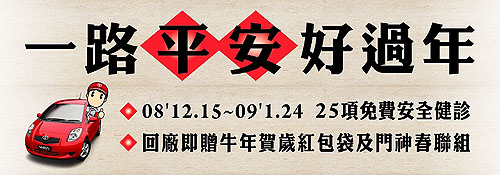 Toyota總代理和泰汽車,自即日起至2009年1月24日止,於全台124個服務廠推出「一路平安好過年」歲末迎春免費安全健診活動,提供車主25項免費安全檢查,入廠還可獲紅包袋與門神春聯組。