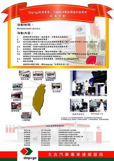 2.行政院消費券價值提昇專案︰持行政院消費券可加值20%折抵車輛保修費用,持1000元可扣抵1200元;持2000元可扣抵2400元;持3600元可扣抵4320元。