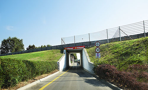 花朵永遠鮮嫩,深處當然也是一片紅色,上方的路牌寫著:Gilles Villeneuve大道,無論你何時來到馬拉涅洛,Ferrari傳奇的歷史殘片俯拾皆是,而在Gilles Villeneuve大道末尾則是另一番光景,一座鐵製小牌樓、一間小崗亭、還有一面大看板:菲歐拉諾賽車場。