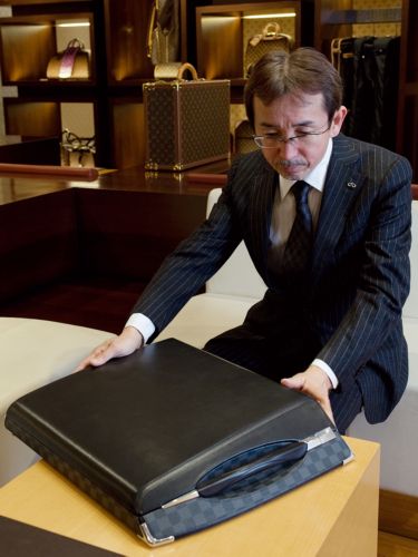 | Nissan 設計總監中村史郎先生端詳 LV 的產品,要將 Infiniti 品牌成立 20 週年的概念車打造成一款精品。 |
