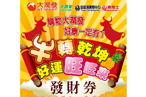 春節期間到大潤發購物滿1000元的消費者,均有獲得一張發財券,其中的金牛進財獎就是免費的簽注券,消費者可拿著簽注券直接到賣場來簽注,期待好運就此來臨,有機會將百萬彩金抱回家!